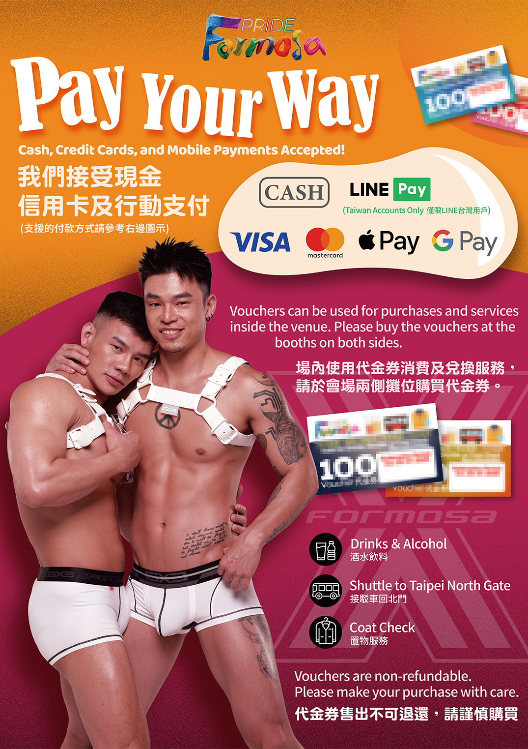 - Accepted: Apple Pay, Google Pay, MasterCard, Visa (Taiwan credit cards included), LINE Pay (Taiwan Users Only), Cash.